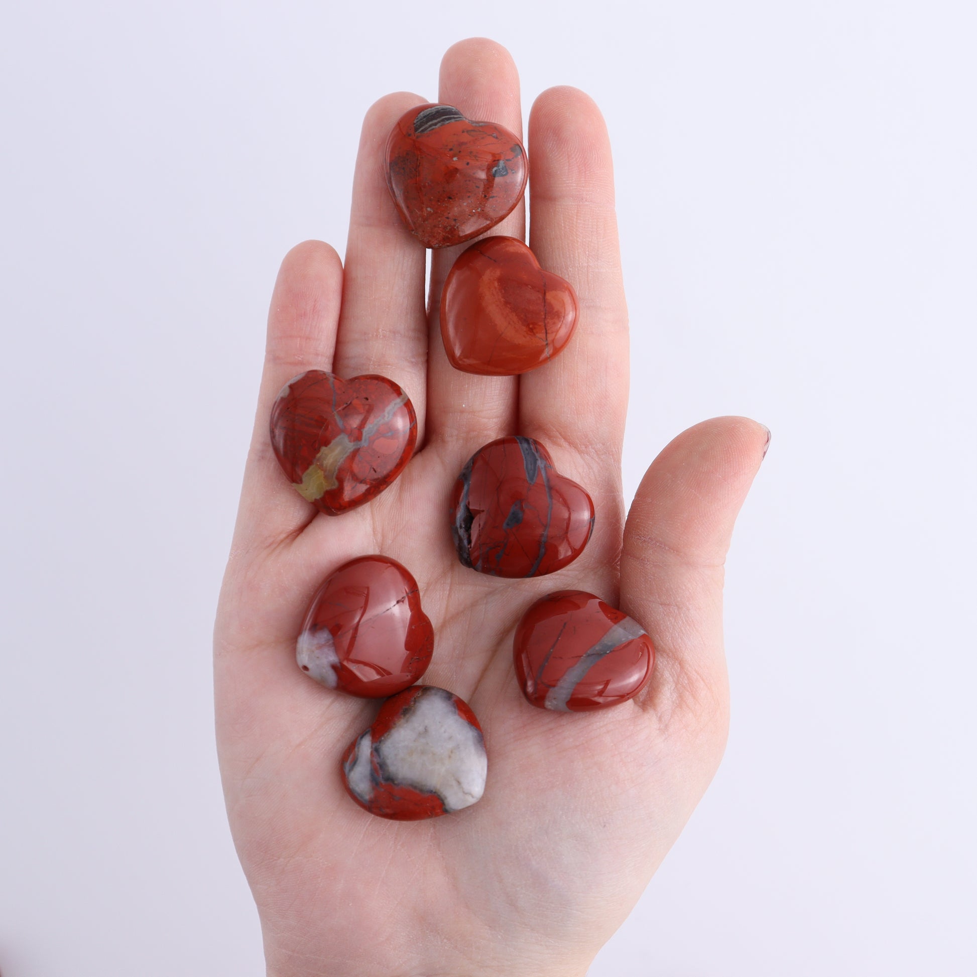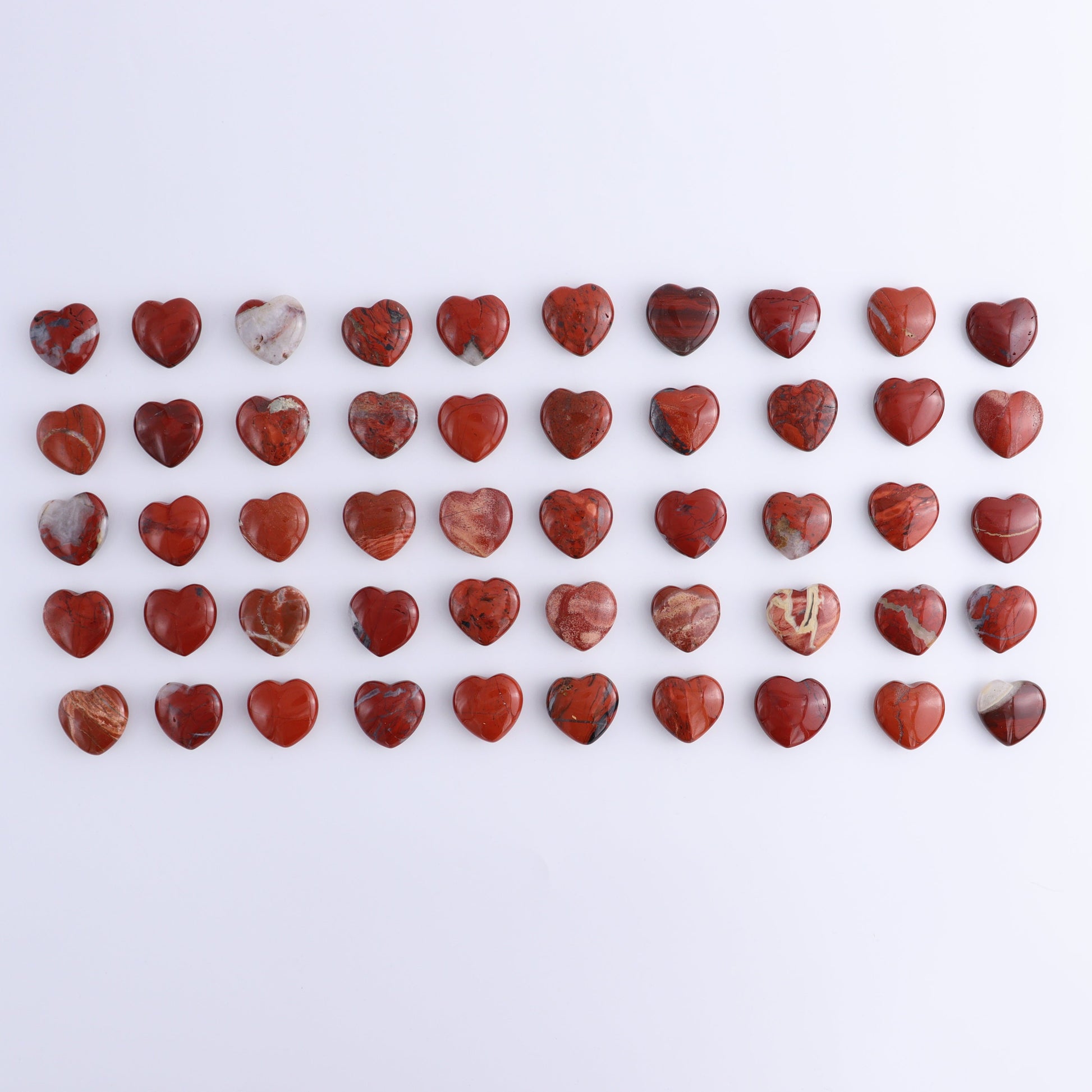 You will receive 50 pieces of Mini Red Jasper Hearts approximately the same size and quality as the ones pictured. Note that patterns, shades, veins, and size may vary.